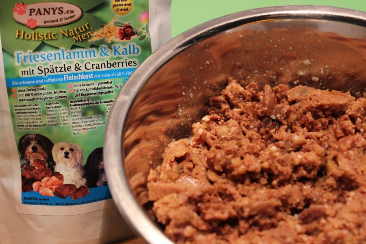 Lecker und ausgewogen in bester PANYS Qualität Für Ihre Lieblinge nur das Beste: Lammfleisch, mit Rind und Kalb, also bestens geeignet für alle die kein Geflügel vertragen. Wie bei allen PANYS Gerichten in Pouchbeutel, stammt die Fleischbrühe nur von den Tieren, die auch in der Zusammensetzung als Fleisch angegeben sind. Cranberrys sind für Hunde sehr gesund, sie enthalten große Mengen Vitamin C und gelten als entzündungshemmend. Mit 4,0 % Spätzle und den nötigen Mineralstoffen, sowie Distelöl, ist es eine rundum gesunde, leckere Mahlzeit für Ihren Liebling. Die Pouchbeutel sind sehr beliebt weil man sie auch für unterwegs bequem mitnehmen kann, einfach aufreißen und rein ins Näpfchen. Sollte mal kein Näpfchen zur Hand sein, frisst so mancher Hund auch gleich aus dem Beutel. Da in den Beuteln eine eingearbeitete Brühe ist, hat Ihr Liebling auch gleich noch die notwendige Flüssigkeit, besonders für alle die wenig saufen gut geeignet. Wenn man dann noch den Beutel mit Wasser ausspült, schmeckt dem Hund das Trinkwasser nochmal so gut. Wenn alles erledigt ist, einfach den Pouchbeutel zusammen rollen und ab in den Müll, so hat man wenig Müll und vor Allem keinen lästigen Dosenmüll. Diese Menüs sind als Alleinfuttermittel für ausgewachsene Hunde zugelassen und mit wenigstens 60,0 % Fleischanteil und ohne Zuckerzusatz, ernährungsphysiologisch ausgewogene Rezepturen. Optimale Lagerung:  7° bis 20° C