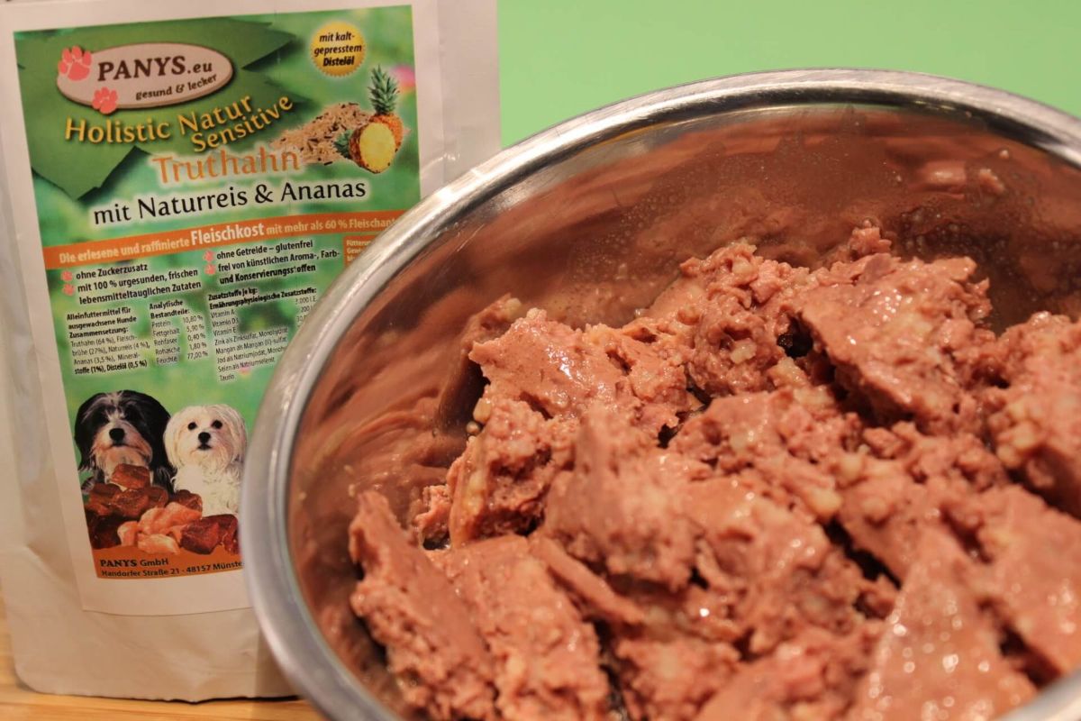 "Holistic Menü" Truthahn, Naturreis.. mit Singleprotein-Rezeptur Truthahn. Also super für alle Hunde geeignet, die Probleme mit rotem Fleischoder Gluten haben. Dieses Menü ist ein Alleinfutter für ausgewachsene Hunde. Mit 4,0 % Reis als Kohlenhydrat gehört  auch dieses Menü zu den glutenfreien Rezepturen. 3,5 % Ananas regt die Eiweiß- und Fettverdauung an und unterstützt einen gesunden Stoffwechsel. Natürlich dürfen auch hier Mineralstoffe und Distelöl nicht fehlen.  Die Pouchbeutel sind sehr beliebt weil man sie auch für unterwegs bequem mitnehmen kann, einfach aufreißen und rein ins Näpfchen. Sollte mal kein Näpfchen zur Hand sein, frisst so mancher Hund auch gleich aus dem Beutel. Da in den Beuteln eine eingearbeitete Brühe ist, hat Ihr Liebling auch gleich noch die notwendige Flüssigkeit, besonders für alle die wenig saufen gut geeignet. Wenn man dann noch den Beutel mit Wasser ausspült, schmeckt dem Hund das Trinkwasser nochmal so gut. Wenn alles erledigt ist, einfach den Pouchbeutel zusammen rollen und ab in den Müll, so hat man wenig Müll und vor Allem keinen lästigen Dosenmüll. Unsere Menüs im Pouchbeutel gibt es in 100 g und 300 g und sind als Alleinfuttermittel für ausgewachsene Hunde zugelassen. Mit mehr als 60,0 % Fleischanteil und ohne Zuckerzusatz, haben alle eine ernährungsphysiologisch ausgewogene Rezeptur. Optimale Lagerung:  7° bis 20° C