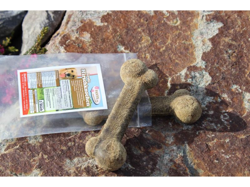 PANYS große Hirschknochen unterstützten die natürliche Gebisspflege für mittelgroße und große Hunde. Optimales Kautraining ohne künstliche Aroma-, Farb- und Konservierungsstoffe. Die Hirschknochen sind auch sehr gut für ernährungssensible Hunde. Sie sind glutenfrei, hart und auch für junge Hunde gut geeignet. Ihr Liebling kann die Kauknochen ruhig auf dem Teppich fressen ohne das Sie einen neuen Teppich brauchen, da die Knochen nicht stinken, nicht schmieren und komplett verzehrbar sind. Wir wünschen ihrem Liebling guten Appetit ! Ein zufriedener, glücklicher Hund liegt uns doch allen am Herzen. PANYS große Hirschknochen gibt es im praktischen wieder erschließbaren Beutel. Zwei große Hirschknochen pro Verpackungseinheit.