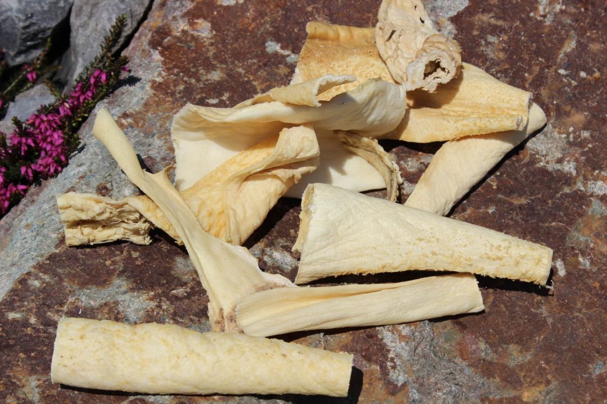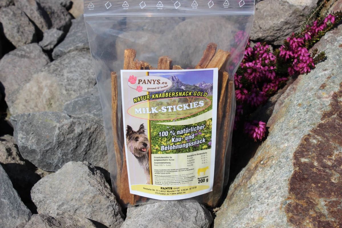 Ultimativer Kauspaß PANYS Milk-Stickies - besonders für ernährungssensible Hunde. Milk-Stickies getrocknet, sind für ausgewachsene Hunde. Hergestellt aus schlachtfrischen Rohstoffen. Der Knabberspaß, der nicht auf die Hüfte geht! Ein paar Kauartikel pro Woche unterstützen zusätzlich eine gesunde Darmflora. Hier hat Ihr Liebling mal etwas zum knabbern. Es ist wichtig für jeden Hund, der noch Zähne hat, die Kaumuskulatur zu trainieren. Es verhindert Zahnsteinbildung und kräftigt die Kaumuskulatur. Wir wünschen ihrem Liebling viel Spaß beim Knabbern! Ein zufriedener, glücklicher Hund liegt uns doch allen am Herzen. Unsere getrockneten Kauartikel stammen von kontrollierten Schlachthöfen und alle Rohstoffe stammen von Tieren, die amtlich zum menschlichen Verzehr zugelassen sind. Modernste Trocknungsanlagen gewährleisten höchste Qualität. Die frische Ware wird bei 60 - 80 ° zwischen 5 und 7 Tagen getrocknet. PANYS Milk-Stickies gibt es im 200 g Beutel.