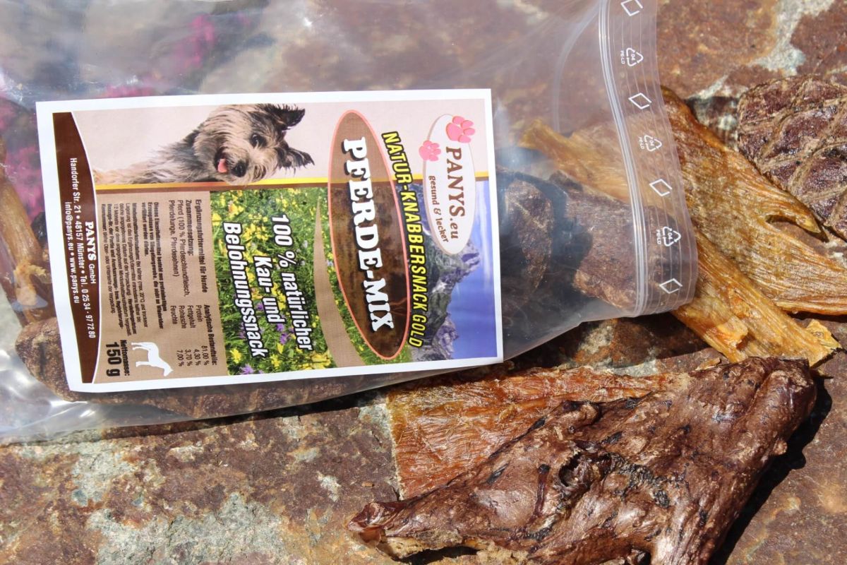 Pferde-Mix getrocknet - der ultimative Kauspaß besonders für ernährungssensible, ausgewachsene Hunde. Hergestellt aus schlachtfrischen Rohstoffen. Der Knabberspaß, der nicht auf die Hüfte geht! Ein paar Kauartikel pro Woche sorgen zusätzlich für eine gesunde Darmflora. Hier hat Ihr Liebling mal etwas zum knabbern, es verhindert Zahnsteinbildung und kräftigt die Kaumuskulatur. Wir wünschen ihrem Liebling viel Spaß beim Knabbern! Ein zufriedener, glücklicher Hund liegt uns doch allen am Herzen. Unsere getrockneten Kauartikel stammen von kontrollierten Schlachthöfen und alle Rohstoffe stammen von Tieren, die amtlich zum menschlichen Verzehr zugelassen sind. Modernste Trocknungsanlagen gewährleisten höchste Qualität. Die frische Ware wird bei 60 - 80 ° zwischen 5 und 7 Tagen getrocknet. PANYS Pferde-Mix gibt es im 150 g Beutel.