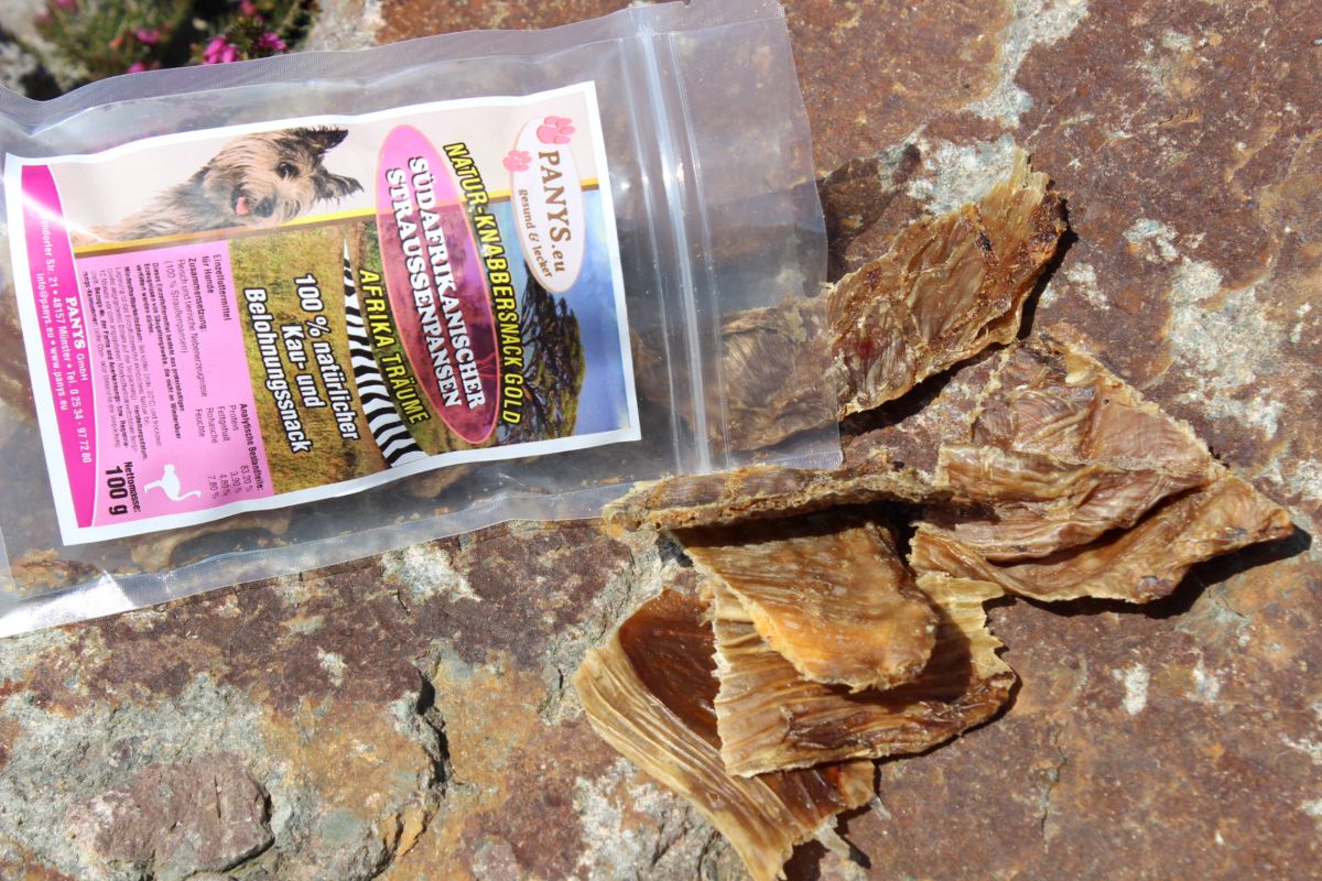 Der ultimative Kauspaß  Südafrikanischer Straußenpansen besonders für ernährungssensible Hunde. PANYS Naturknabbersnack Gold "Afrika Träume". Der Knabberspaß, der nicht auf die Hüfte geht! Hier hat Ihr Liebling mal etwas zum knabbern, es ist wichtig für jeden Hund, die Kaumuskulatur zu trainieren. Außerdem kann dadurch die Zahnsteinbildung verhindert und die Kaumuskulatur gestärkt werden. Wir wünschen ihrem Liebling viel Spaß beim Knabbern! Ein zufriedener, glücklicher Hund liegt uns doch allen am Herzen. Unsere getrockneten Kauartikel stammen von kontrollierten Schlachthöfen und alle Rohstoffe stammen von Tieren, die amtlich zum menschlichen Verzehr zugelassen sind. Modernste Trocknungsanlagen gewährleisten höchste Qualität. Die frische Ware wird bei 60 - 80 ° zwischen 5 und 7 Tagen getrocknet. PANYS Südafrikanischer Straußenpansen gibt es im praktischen wieder verschließbaren 100 g Beutel.